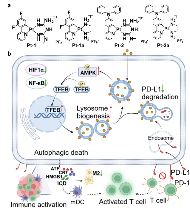 毛宗万教授、曹乾副教授团队长期致力于发展金属抗肿瘤免疫化合物,主要包括非经典环金属铂(Angew. Chem. Int. Ed. 2023, 62, e202216917;Angew. Chem. Int. Ed. 2023, 62, e202312170.)配合物和其他过渡金属配合物(Angew. Chem. Int. Ed. 2022, 61, e202115800)。近日,他们开发了一类铂(II)-二甲双胍偶联物Pt-Met,作为免疫化疗中基于抗体的PD-L1抑制剂的有前景的替代品。Pt-Met中的环金属化Pt组分不仅显著改善了二甲双胍的细胞摄取,而且选择性地将其运输到溶酶体,同时为细胞成像提供了良好的光物理特性,并为化疗提供了优异的抗癌活性。机制研究表明,Pt-Met可以选择性地在溶酶体中积累,不仅破坏细胞表面的PD-1/PD-L1轴,而且通过AMPK-TFEB途径促进溶酶体的生物生成和活性,抑制PD-L1表达和促进溶酶体依赖的PD-L1降解,从而全面下调非小细胞肺癌中PD-L1的总体水平。在小鼠实验中,Pt-Met也表现出优于顺铂的抗肿瘤效率,毒副作用小,且可以通过下调PD-L1水平、诱导巨噬细胞极化、促进DC成熟和增强肿瘤组织中的淋巴细胞浸润来有效激活抗肿瘤免疫,最终通过单个小分子在体内实现高效的抗肿瘤免疫化疗。