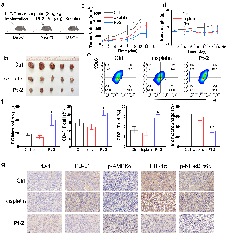 图3. Pt-2作为PD-L1小分子抑制剂在体内实现高效的抗肿瘤免疫化疗。