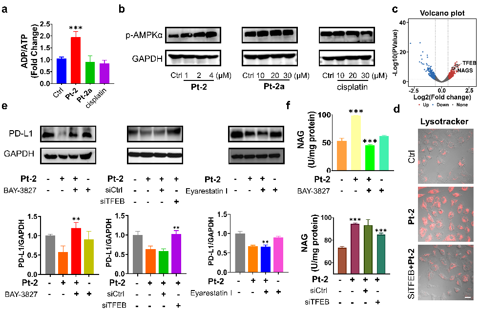 图2. 铂(II)-二甲双胍偶联物Pt-2通过AMPK-TFEB途径抑制PD-L1表达和促进溶酶体依赖性PD-L1降解