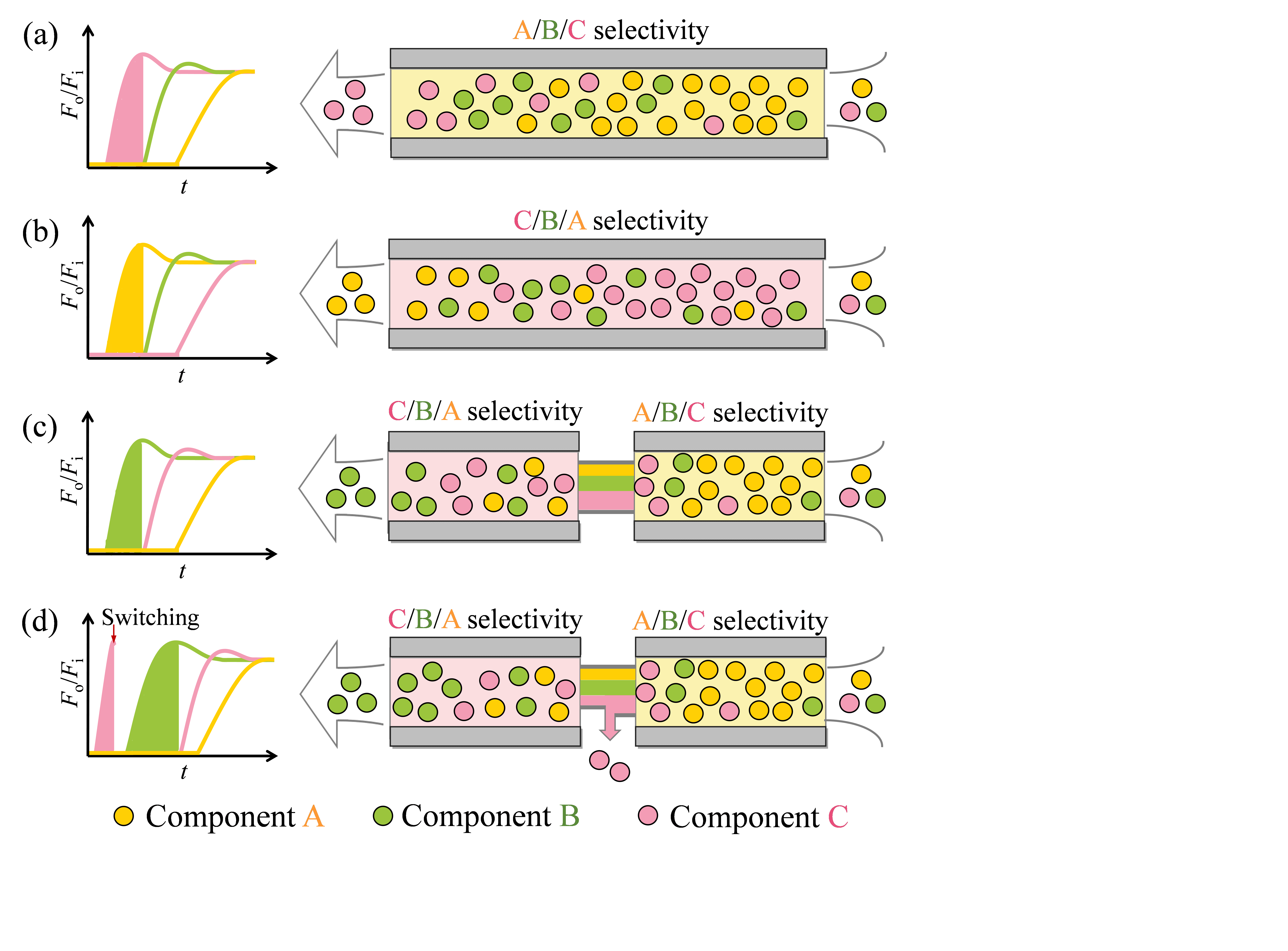 图1. 单一或组合型选择性材料经过一次吸附操作后可分离/纯化出混合物中不同的产品。