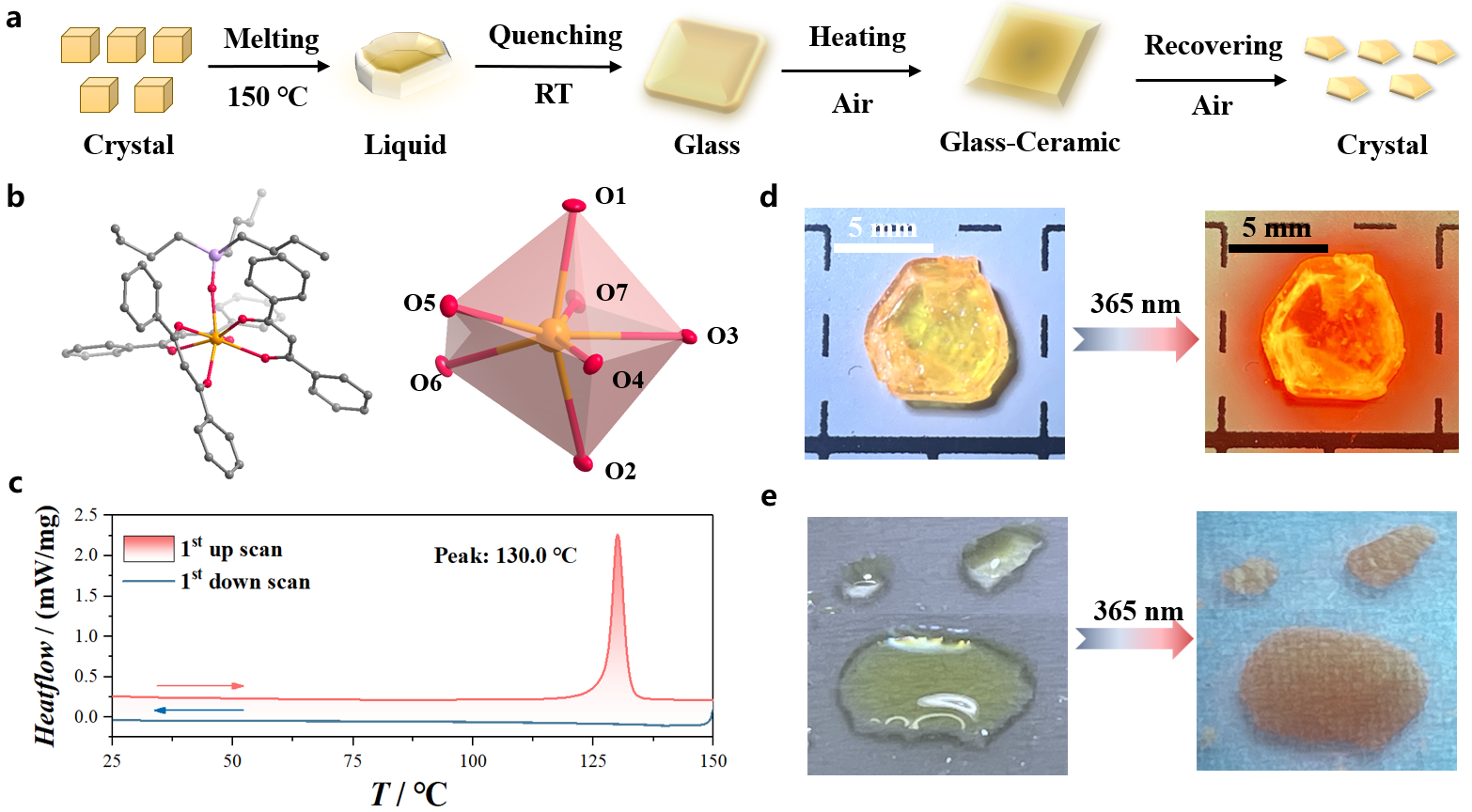 1.晶体液体玻璃玻璃陶瓷晶体”相变过程示意图 (a)1-Ln的晶体结构(b);一轮升降温的DSC测试分析(c) 以及晶态和液态的实物及其发光照片 (de)