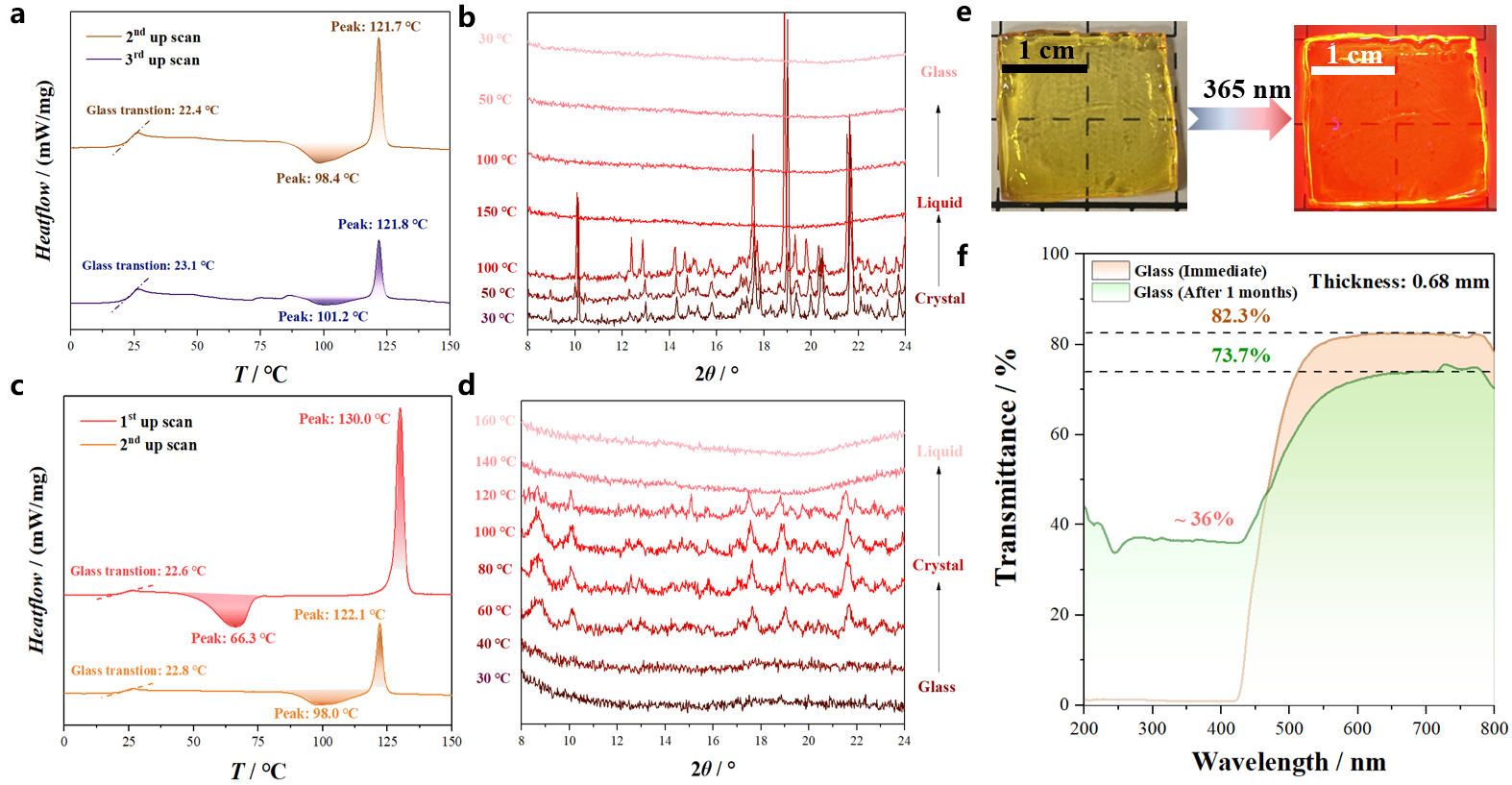 2.晶态1-Ln及玻璃态1-Ln-QDSC测试分析 (ac);原位变温PXRD衍射图样 (bd)以及玻璃态1-Ln-Q的实物及其发光照片(e)和透射率曲线(f)