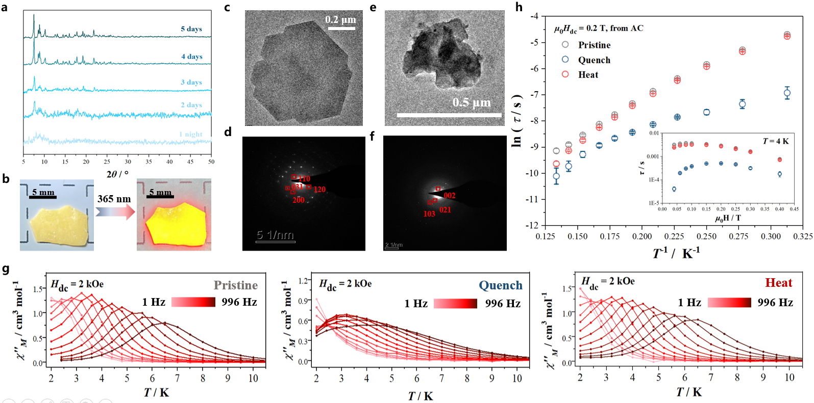 3.玻璃陶瓷态1-Dy-QPXRD (a);实物及其发光照片 (b)TEM (c d) SADE电子衍射环图像 (d f) 以及相关磁学性质分析 (hg)