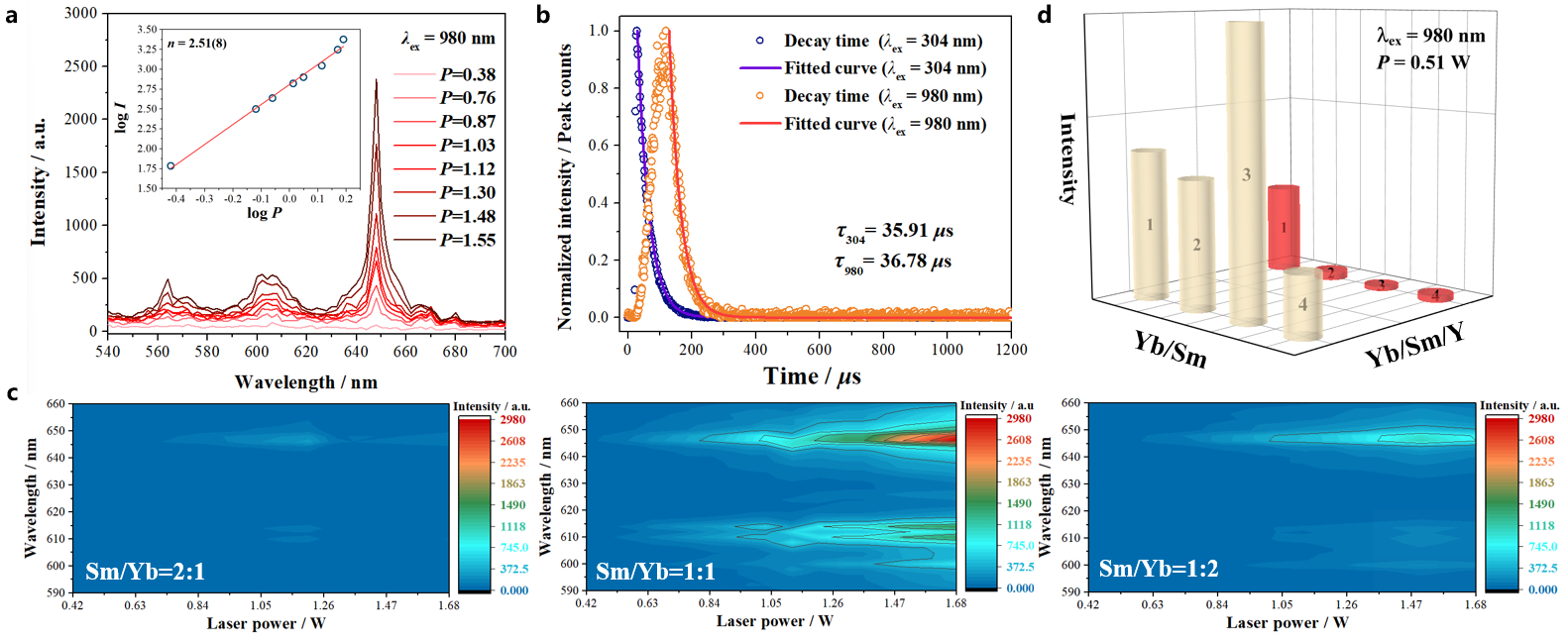 4.多元分子固溶体(1-Y)/1-Yb/1-Sm 的上转换发光谱图 (a);衰减寿命曲线 (b) 以及不同比例稀土组分的发光射强度分析 (cd)