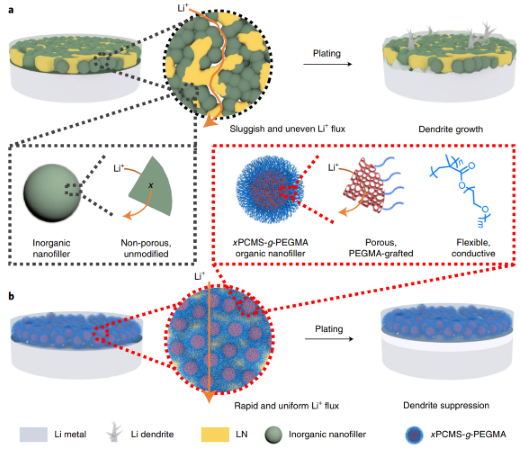 锂金属—电解液界面通常组分不均一且稳定性差,容易引发不可控的锂枝晶生长,并迅速降低电池的循环稳定性,从而严重阻碍锂金属电池的实际应用。有鉴于此,swag色情 吴丁财教授和刘绍鸿副教授等人最近通过多孔高分子刷(超交联聚4-氯甲基苯乙烯纳米球表面接枝聚(低聚乙二醇)甲基丙烯酸甲酯,简称为xPCMS-g-PEGMA)与单离子导电锂化Nafion树脂的合理集成,发展了一种坚固的全有机人工界面保护层,由此获得了高效的无枝晶锂金属负极。具有刚性超交联骨架的多孔xPCMS内核不仅显著提高了人工保护层的机械强度,还可提供快速的锂离子传输通道;与此同时,柔性的PEGMA 侧链以及锂化Nafion树脂有利于形成结构稳定、锂离子扩散均匀且锂离子迁移数高的人工保护层。在该人工固体电解质界面层的保护下,锂金属负极可在10 mA cm-2的超高电流密度下实现超过9100小时(>1年)的超长稳定循环,并在10 mAh cm-2的大面容量下实现超过2800小时的稳定可逆锂沉积/剥离。进一步地,当与高载量正极(~4 mAh cm-2)配对时,受保护的锂负极也显示了出色的电池稳定性,说明实际应用前景广阔。